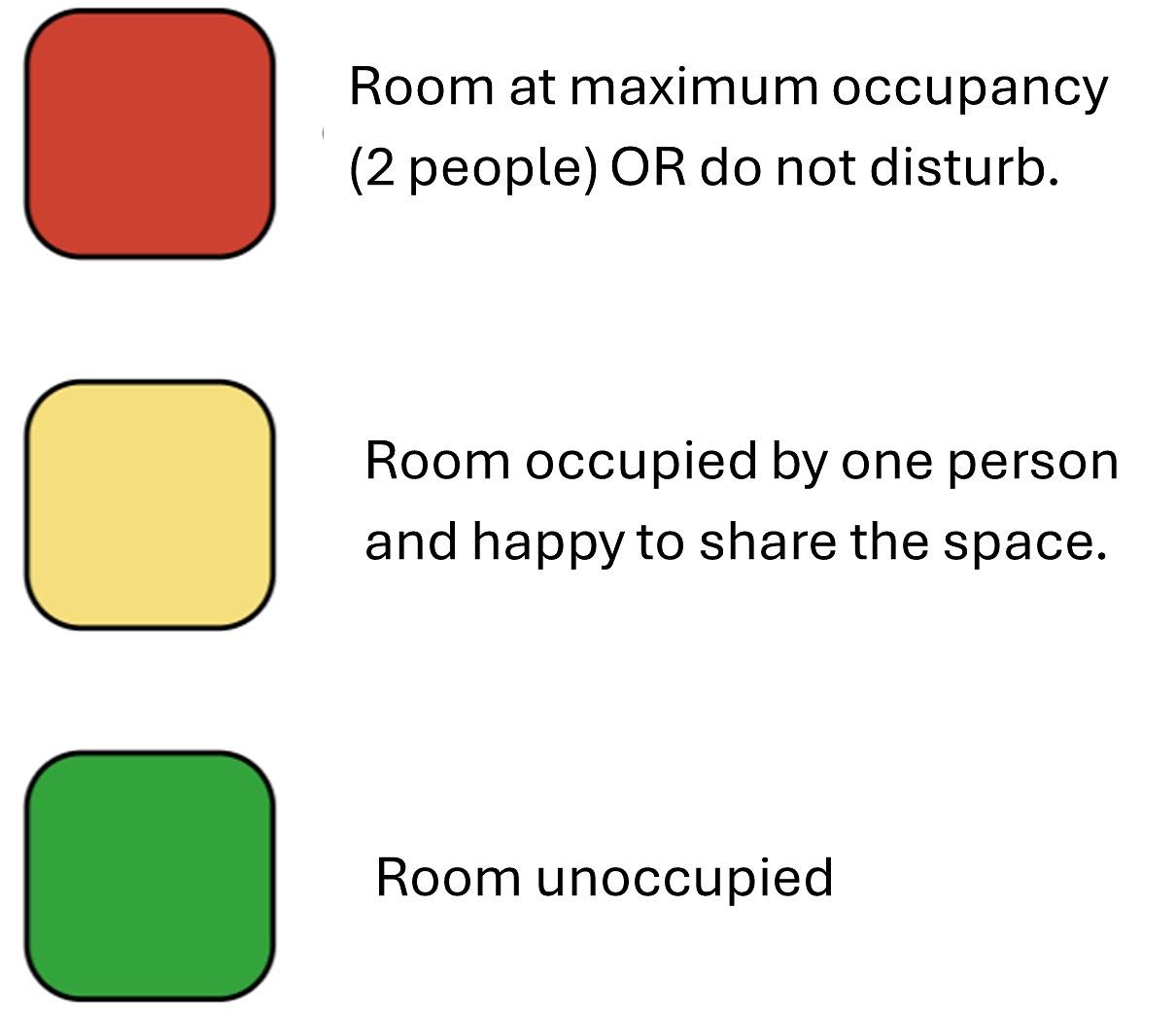 To use the room, just speak to a member of staff on the Welcome Desk. If you're eligible, they'll sign out a blank ID card that gives you access to the Sensory Study Room. Once inside, use the traffic light system on the bottom window of the door to show how you'd like to use the space: