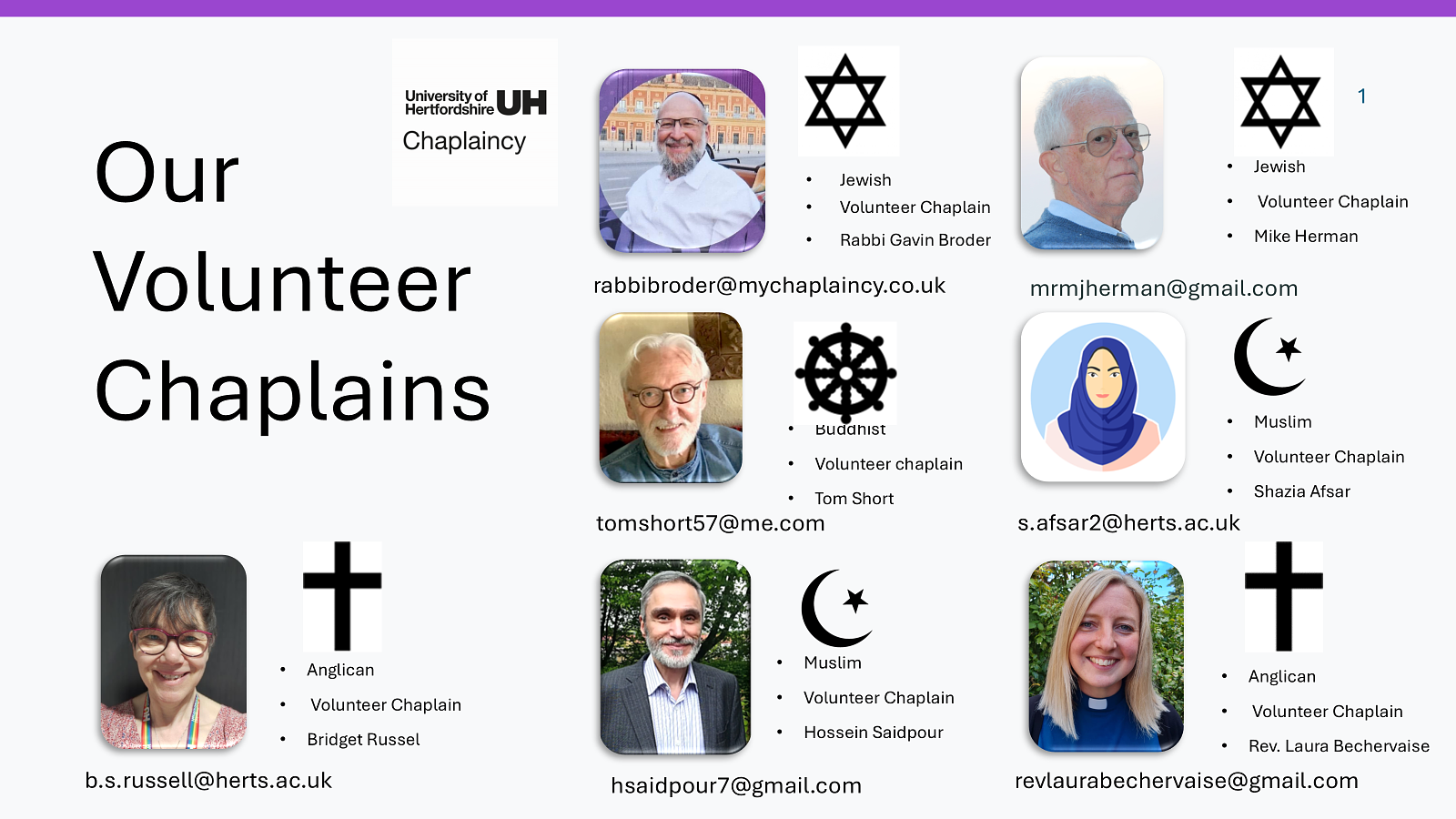 We also have a team of volunteer chaplains if you would like support with a particular faith. Please contact chaplain@herts.ac.uk if you would like us to put you in contact with one of them.