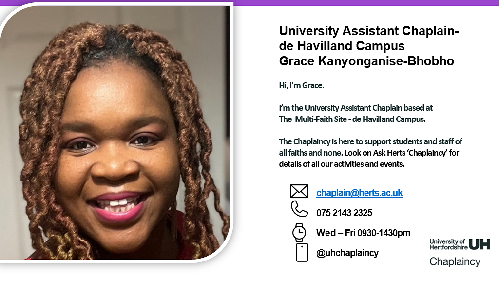 - Grace manages the Multi Faith Space and the Chaplaincy service on the de Havilland campus. You can contact Grace in the office 09:30-14:30 Wednesday-Friday, or on chaplain@herts.ac.uk